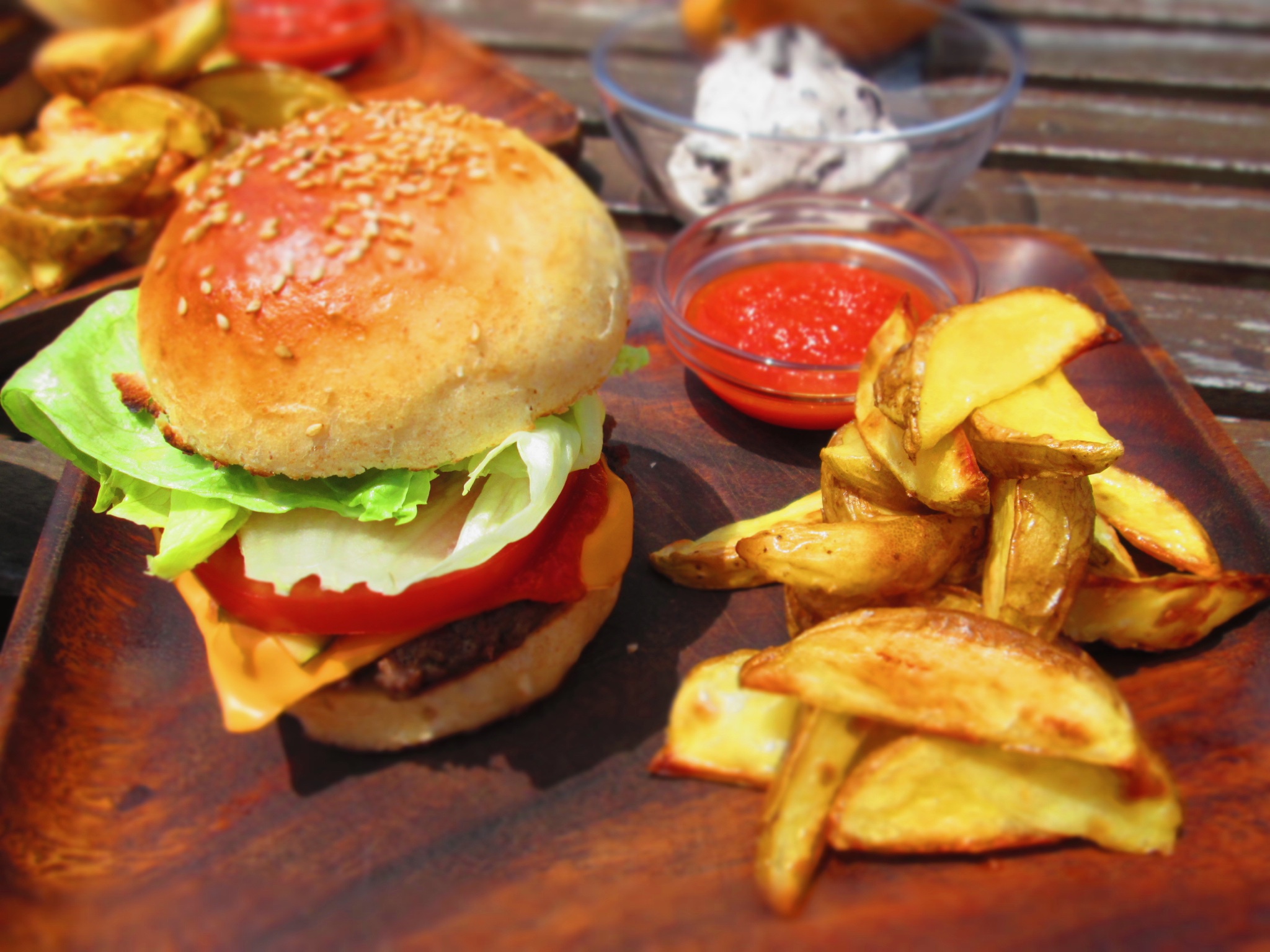 基本のシンプルなハンバーガーです。全粒粉入りのセサミバンズとジューシーなビーフパテをマスターしましょう。夏の新鮮な野菜もたっぷり使って自分だけのオリジナルバーガーを作りましょう。ファストフードではなかなか出会えない豪快でフレッシュな美味しさです。手作りケチャップがさらに美味しさを際立たせます。